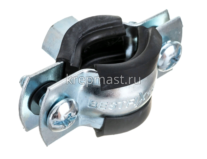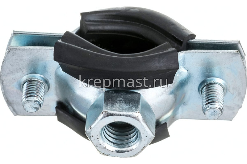Хомут сантехнический с гайкой 12-16 мм представляет собой две металлические пластины, соединенные по краям регулировочными винтами м6 и резиновым уплотнителем. К хомуту приварена гайка м8 с метрической резьбой. Диаметр обжима трубы составляет от 12 до 15 мм. Изготавливается из оцинкованной стали толщиной 1 мм.