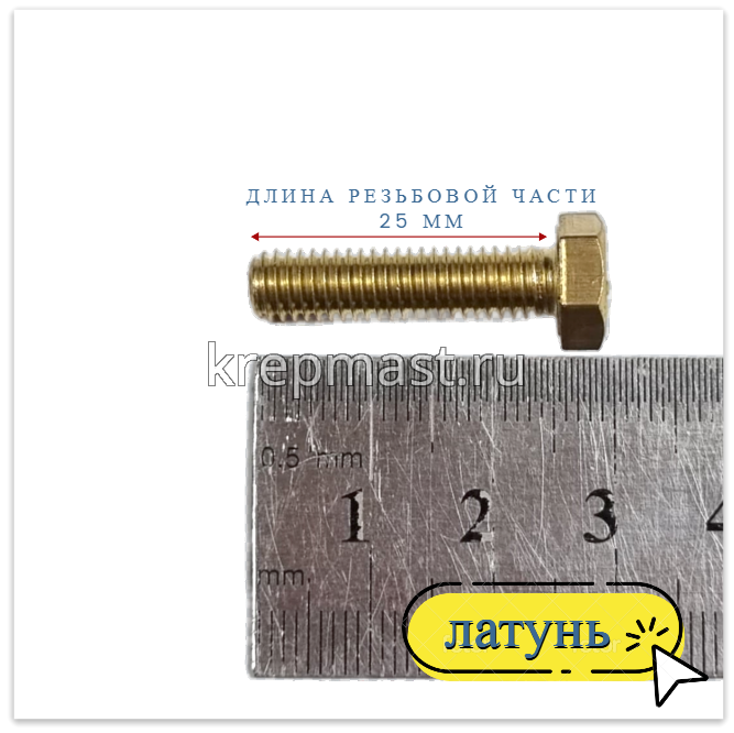 Болт 6х25 DIN 933 латунь в интернет-магазине «Мастер Крепежа» по цене 53 руб. Более 26 наименований товаров в наличии в категории Болты латунные DIN 933. Купить болт 6х25 din 933 латунь в Лаишево выгодно Вы можете on-line на нашем сайте, или отправив заявку по почте, а также по телефону или в пункте выдачи компании г. Казань, ул. Татарстан, 9, магазин "Мастер Крепежа". Доставка по Республике Татарстан и другие регионы РФ.