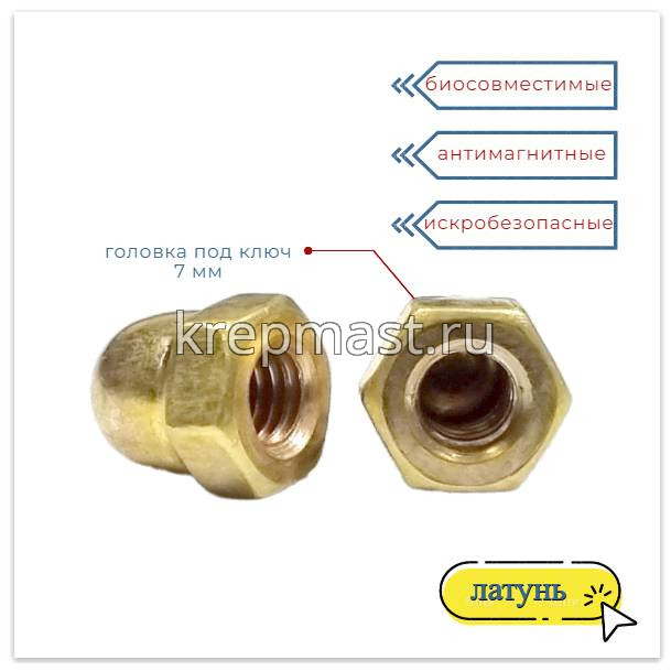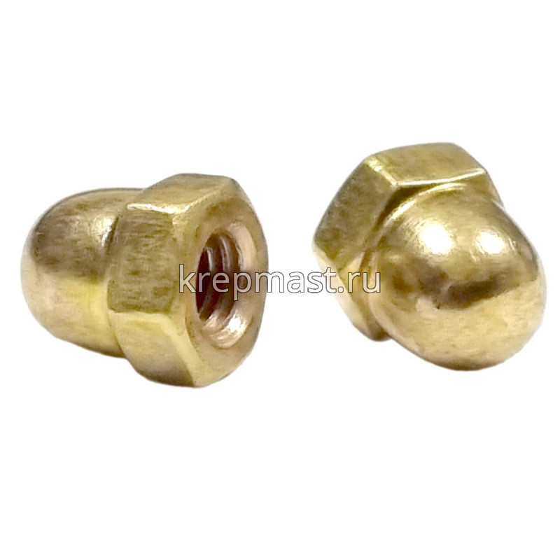 Гайка колпачковая М 4 DIN 1587 латунь применяется в приборостроении, авиации, атомной промышленности. Латунный крепеж стоек к органическим кислотам и углекислым растворам.