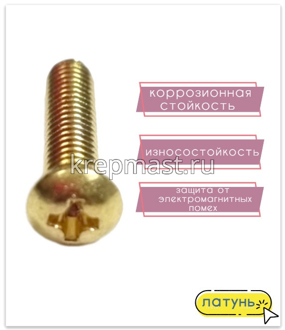Винт латунный с полукруглой головкой DIN 7985 / ГОСТ 17475 М 4 х 16 используется в случае, когда необходимо создать немагнитный узел. Латунный винт применяется в приборостроении, авиации, атомной промышленности. Латунный крепеж стоек к органическим кислотам и углекислым растворам.