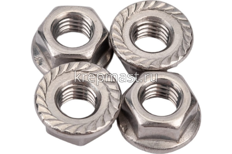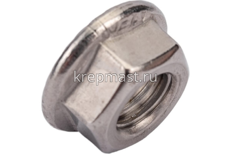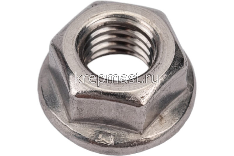 Нержавеющая гайка с фланцем М 8 DIN 6923 А2 крепежный элемент, совмещающий в себе шестигранную гайку с одной стороны и фланец (плоскую деталь круглой формы) — с другой. Другие названия этого метиза — гайка фланцевая, самостопорящаяся, с прессшайбой. Крепление производится с помощью гаечного ключа.
