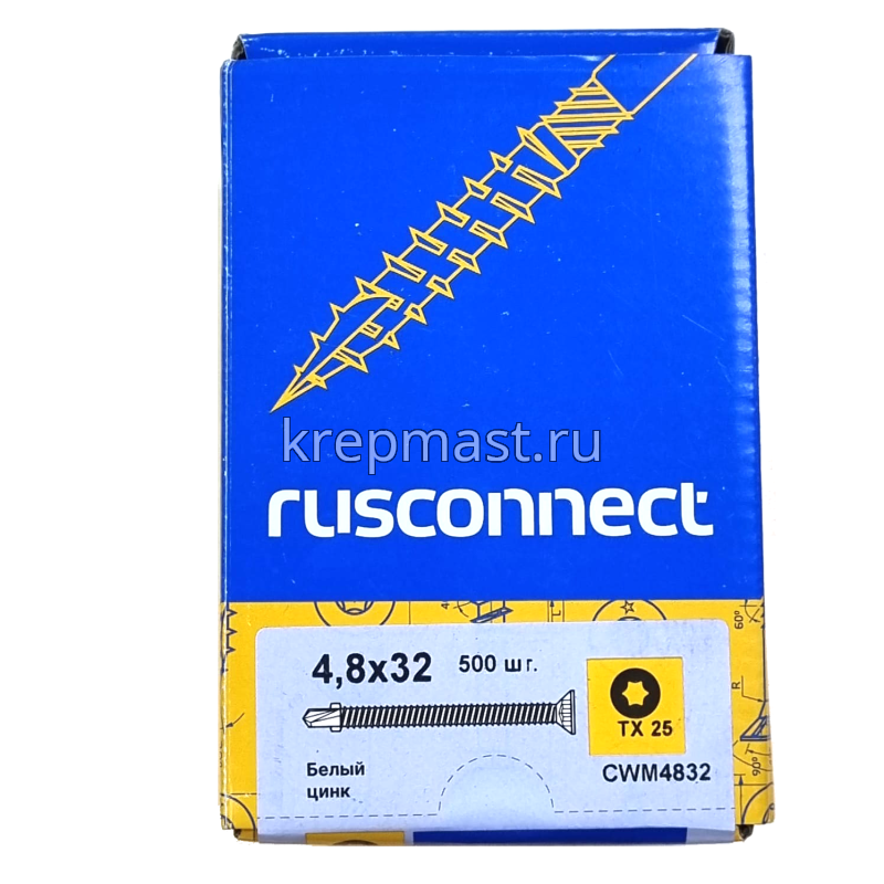 Саморез кровельный ТХ20 с ушками без шайбы DIN 7504 P 4,8х32 потай. - сверло оцинк. Rusconnect применяется для крепления деревянной доски к металлической обрешетке. На острие самореза находится бур с двумя выступающими "ушками", которые свободно проходят через древесину и обламываются, когда саморез достигает металла. На нижней стороне потайной головки есть несколько выступов предназначенных для самозенковки и аккуратного утапливания заподлицо с поверхностью. Помимо досок данными саморезами можно крепить фанеру, ДСП и плиты МДФ.