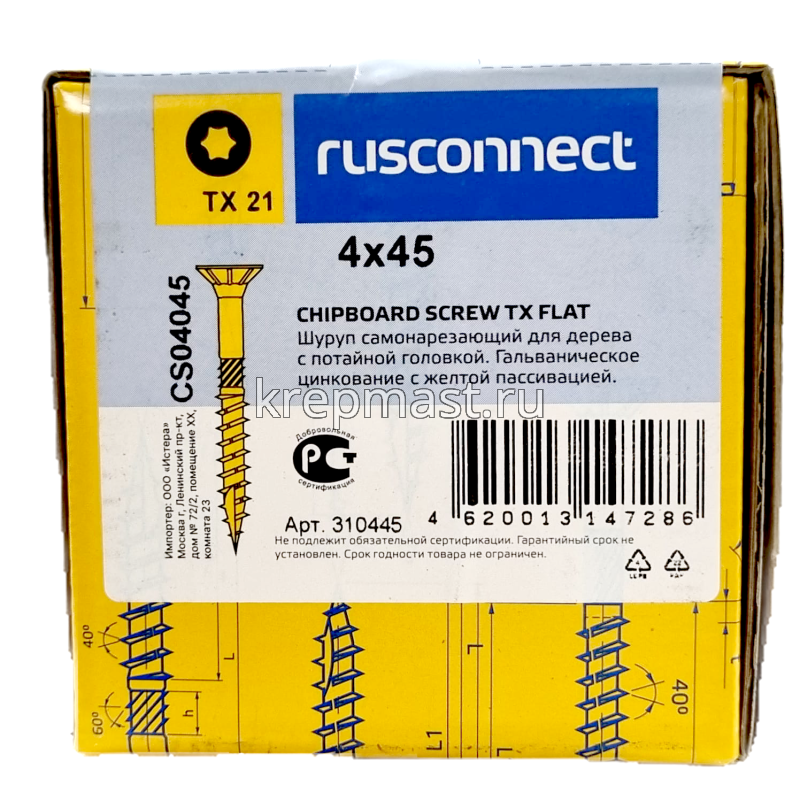 Шуруп с/нарез. для дерева потай 4,0х 45 Тх в интернет-магазине «Мастер Крепежа» по цене 8 руб. Более 43 наименований товаров в наличии в категории Шурупы КОНСТРУКЦИОННЫЕ для дерева. Купить шуруп с/нарез. для дерева потай 4,0х 45 тх в Лаишево выгодно Вы можете on-line на нашем сайте, или отправив заявку по почте, а также по телефону или в пункте выдачи компании г. Казань, ул. Татарстан, 9, магазин "Мастер Крепежа". Доставка по Республике Татарстан и другие регионы РФ.