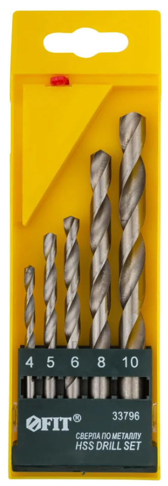 Набор сверел по металлу 5шт FIT (4-5-6-8-10мм) предназначен для профессионального использования. Класс точности сверел А1. Цилиндрический хвостовик. Угол заточки 135°.