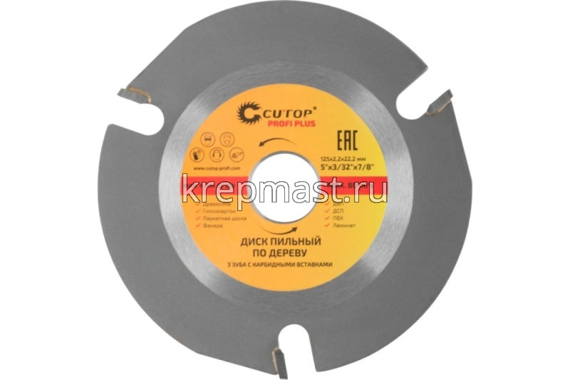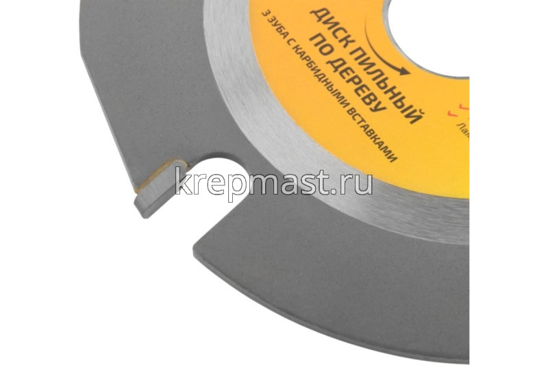 Диск имеет 3 твердосплавные напайки из карбида вольфрама, что обеспечивает безопасность при высоких оборотах, устойчивость к деформации и воздействию температур.