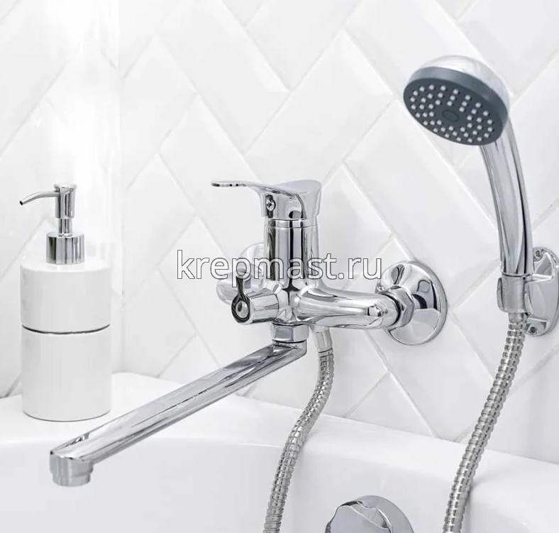 Стильный и функциональный однорычажный смеситель для ванны и душа с длинным поворотным изливом удобен и надежен в использовании.