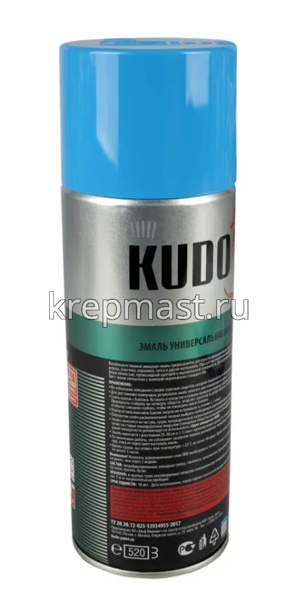Универсальная алкидная краска эмаль-аэрозоль KUDO RAL 1010 голубая 520 мл удобна в нанесении за счет спрей-системы, используется для покраски стекла, пластика, бумаги, дерева, металла и др. Краска быстро высыхает и обладает высокой адгезией. Применяется для наружных и внутренних работ. Краска устойчива к ультрафиолету.