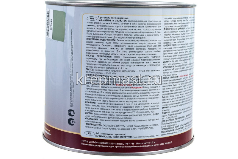 Грунт-эмаль 3 в 1 Лакра серый, 1.7 кг Лк-00002798 предназначен для окрашивания и защиты от ржавчины поверхностей из металла. Средство наносится в один-два слоя. Перед использованием грунта-эмали следует очистить поверхность от загрязнений. Подойдет для окрашивания как не поврежденного металла, так и с наличием ржавчины толщиной до 0.1 мм.